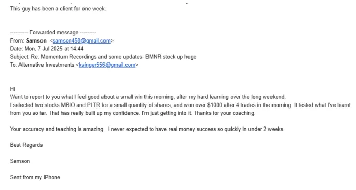 One client applied momentum stock strategies after training and earned $1,000+ profit in just one week.
